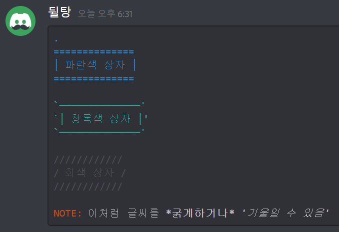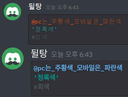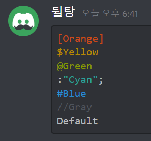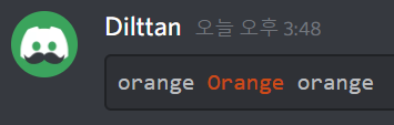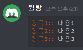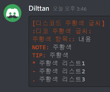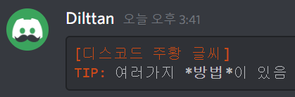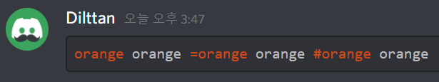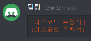 asciidoc은 가장 주황색을 입력하기 좋은 언어명입니다! 주황색의 범위를 마음대로 조절할 수 있고, 입력하는 방법도 다양합니다. 우선 첫 번째 줄에는 억음부호 3개(```)와 asciidoc이라 적어주세요. (이 때 억음부호 3개 뒤에 적는 영단어를 언어명이라 부를게요.) 그 후에는 아래 방법을 따라해주세요. 다 적으신 후 마지막에 다시 억음부호 3개(```)를 입력하시면 글자색이 주황색으로 적용됩니다. 만약 이해가 가지 않으신다면 위 입력칸에 있는 내용을 복사해서 디스코드에 붙여넣기 해보세요. 또는 블로그 디코 서버에 오셔서 물어보셔도 됩니다!