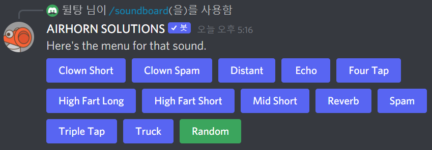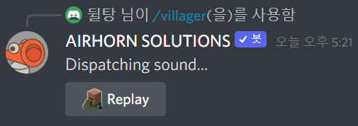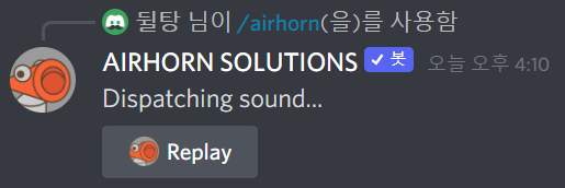 /airhorn 명령어를 한번 실행시키면 위와 같이 메시지가 뜹니다. 여기서 Replay 버튼을 누르면 다시 한번 실행시킬 수 있습니다.