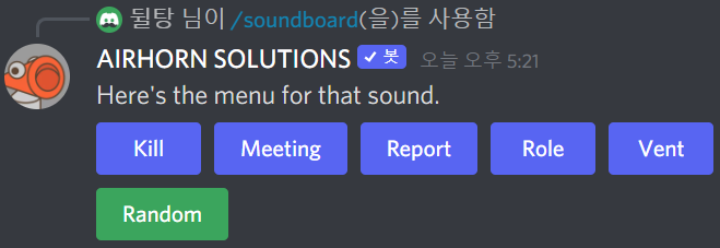 위의 morehorn과 마찬가지로 /soundboard를 이용하면 어몽어스 효과음들을 한 번에 실행시킬 수 있는 버튼 묶음을 만들 수 있습니다. sound에서 Among Us를 선택해주시면 되요.