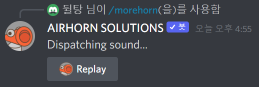 /morehorn 명령어도 /airhorn을 포함한 다른 봇의 명령어들처럼 한번 입력하면 위처럼 Replay 버튼이 뜹니다.