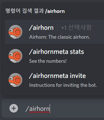 음성 채널에 들어간 상태에서 채팅창에 /airhorn이라 치시면 에어혼 소리를 냅니다! 슬래시 명령어이기 때문에 일부만 쳐도 위처럼 명령어가 나와 잘 쳤는지 확인할 수 있습니다.