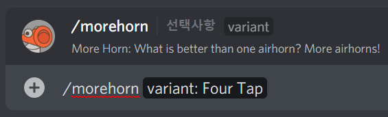 /morehorn 명령어를 쳐서 더 많은 에어혼 소리를 낼 수 있습니다! /morehorn 명령어에는 낼 수 있는 소리의 여러가지 종류(Variant)가 많습니다. Variant의 목록은 아래와 같습니다. Variant의 종류는 명령어 뒤쪽에 띄어쓰기를 한 후 다시 띄어쓰기를 입력하시면 볼 수 있습니다. 이 목록에서 클릭해서 선택하거나, 영문명을 쓰시면 됩니다! 예를 들어 뿌이뿌이뿌이 소리를 내시려면 variant에서 Four Tap을 선택해주세요.