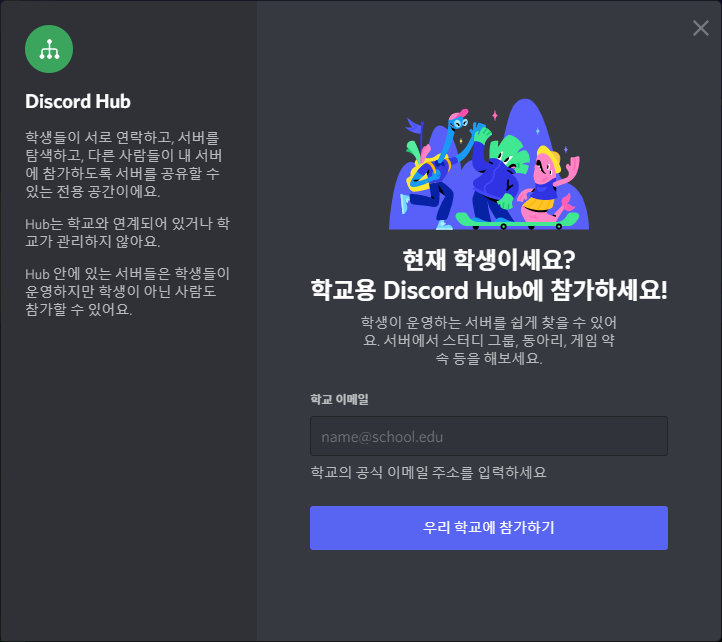 디스코드 학교 허브(School Hub, Student Hub)는 디스코드에서 같은 학교 사람들끼리 만날 수 있는 서버입니다! 학교 이메일을 입력하고 인증하면 들어가실 수 있습니다. 학교 서버에서 스터디 그룹, 동아리, 게임, 약속 등을 할 수 있습니다!
