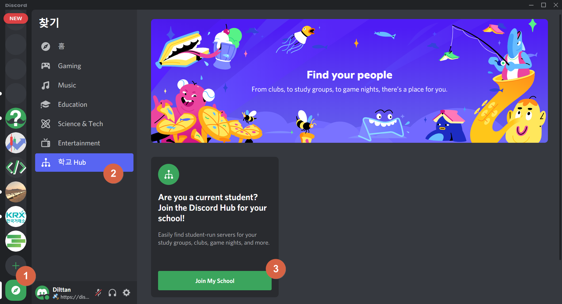 학교 Hub에 들어가시려면 우선 맨 왼쪽 서버 목록 맨 아래에 있는 나침반 모양 아이콘을 클릭해주세요. 그 후 찾기 맨 밑의 학교 Hub를 클릭해주세요. 그리고 오른쪽에 화면이 뜨면 Join My School을 클릭하시면 됩니다!