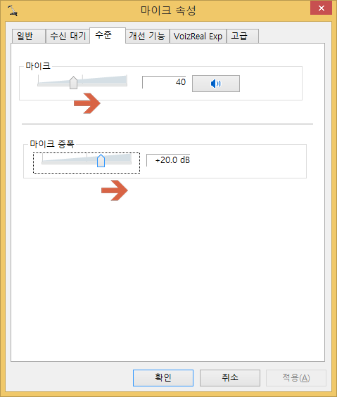 그다음 수준 탭에서 마이크 음량 크기와 마이크 증폭 크기를 둘 다 늘려주세요. 마이크 증폭은 너무 늘릴 경우 잡음이 커질 수 있으니, 마이크 음량 크기를 먼저 늘리고 안 된다 싶으면 늘려주세요.