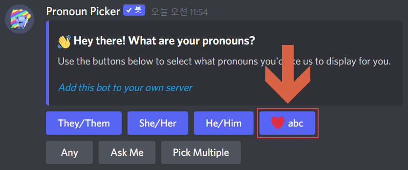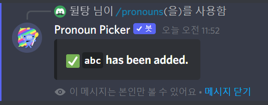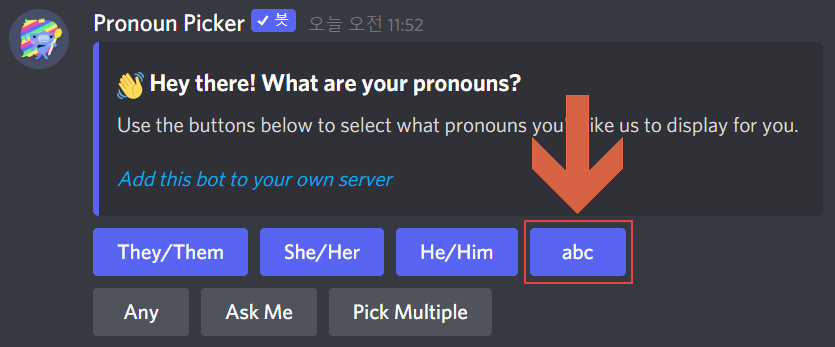 - Pick Multiple : 여러 개의 성 대명사를 고릅니다. 아래와 같이 자신만이 볼 수 있는 메시지가 뜨며, 클릭하면 버튼의 색이 파란색이 되며 선택됩니다. 역할로 표시할 때만 뜨게 됩니다.
