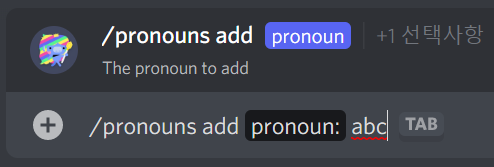 /pronous add (대명사)를 입력하면 새롭게 커스텀 대명사를 추가시킵니다.