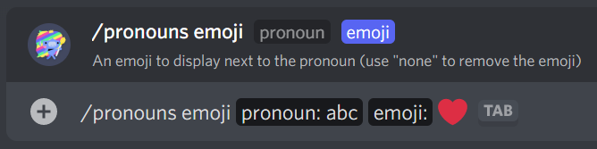 원하는 성 대명사가 없으시면 /pronous 명령어를 이용해 추가시켜줄 수 있습니다. 또 추가된 대명사를 삭제할 수도 있고요. 성 대명사 버튼에 이모지를 넣어 꾸미는 것도 가능합니다.