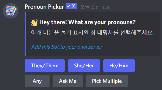 Pronoun Picker는 2021년 6월 성 소수자의 달(Pride Month)을 기념으로 만들어진 디스코드 공식 봇입니다. 이 봇은 사용자가 자신의 성 대명사(pronoun, 프로나운)을 골라 표시할 수 있게 만들어줍니다. 새로운 대명사를 추가하거나 삭제할 수도 있습니다. 또한 기본적으로는 역할로 표시되지만, 닉네임 앞에 표시되도록 바꿀 수 있어요. 성 소수자의 달은 이미 2개월도 더 지났지만 리뷰해볼까 합니다.