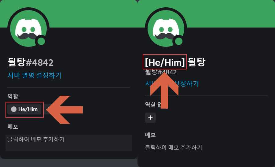 이를 False로 설정하면 역할은 사라지고 별명 앞에 대명사가 표시되게 됩니다.