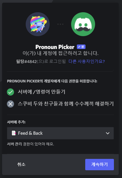 위 링크를 눌러서 서버에 초대해주세요. 클릭하면 뜨는 창에서 추가하고 싶은 서버를 고르시면 됩니다. 자신이 관리자 권한을 가지고 있는 서버에서만 추가 가능합니다. 혹시 봇을 추가하는 법에 대해 익숙지 않으신 분들은 아래 링크를 클릭해서 자세한 내용을 봐주세요.