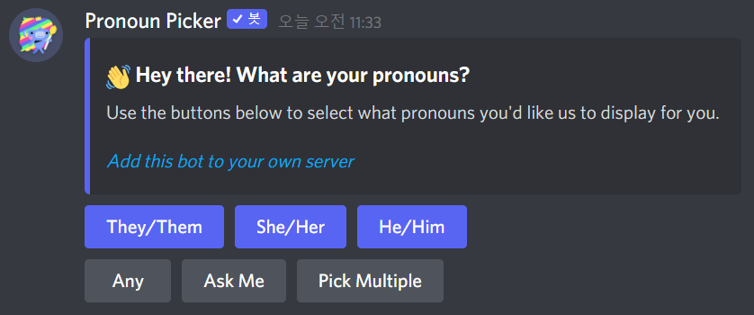 지금까지 디스코드 Pronoun Picker 봇을 사용하는 법에 대해서 알아봤습니다. 혹시 설정하시다 막히시는 부분이 있으시면 아래 링크를 클릭해 서버에 들어와 물어봐주세요!