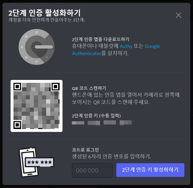 QR코드 스캔으로 등록하려면 디스코드 안내창 왼쪽에 있는 QR코드를OTP 앱으로 찍어주시면 됩니다. 설정키 입력으로 등록을 하려면 디스코드 화면에 2단계 인증키 (수동 입력) 아래에 있는 12자리 문구를 OTP 앱에 입력해주시면 됩니다. QR코드 스캔으로 등록하는걸 추천드립니다! 참고로 위의 QR코드나 인증 키는 남들이 보면 똑같이 OTP 등록을 하고 로그인에 이용할 수 있으니 절대 공유하거나 하지 말아주세요.