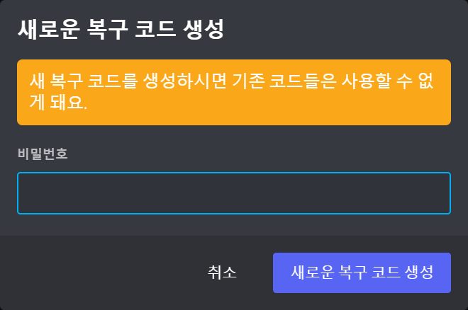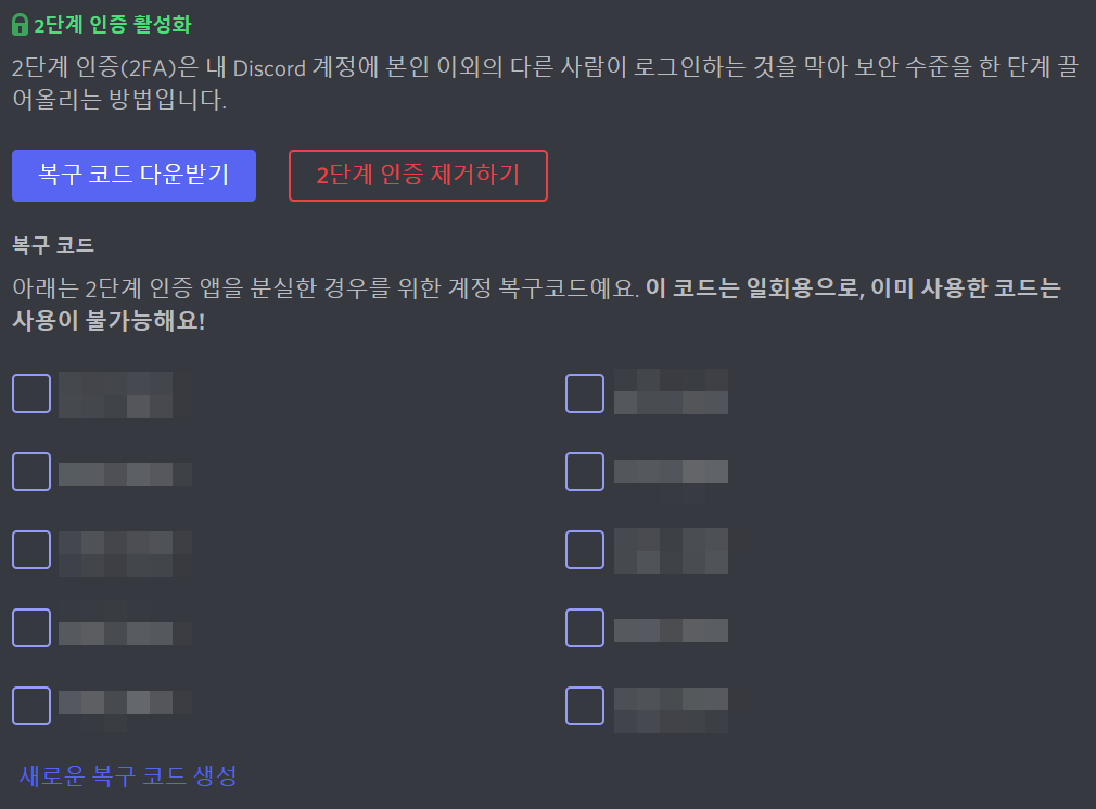 만약 복구 코드를 거의 다 쓰셨으면 아래 새로운 복구 코드 생성을 눌러 복구 코드를 다시 초기화시킬 수 있습니다. 새 복구 코드를 만들게 되면 기존 코드들은 사용할 수 없습니다.