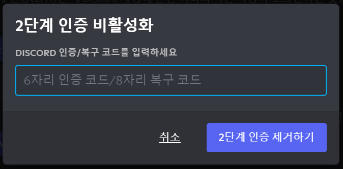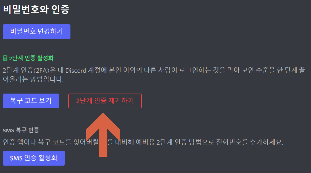 디스코드 2단계 인증 제거하기 버튼을 눌러 인증을 손쉽게 제거할 수 있습니다.