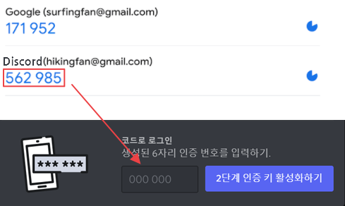 세 번째 단계는 코드로 로그인입니다. OTP 앱에 등록하셨으면 위와 같이 위에는 Discord와 아이디 이메일이 적혀있고 아래에는 파란색의 6자리 숫자가 있는 항목이 생겨났을 겁니다. 여기서 파란색 6자리 숫자를 디스코드 화면의 빈칸 안에 넣어주시면 됩니다. 숫자는 1분마다 새로운 숫자로 바뀌게 되니 재빠르게 입력해주세요. 숫자를 입력한 다음 2단계 인증 키 활성화하기 버튼을 눌러주세요.