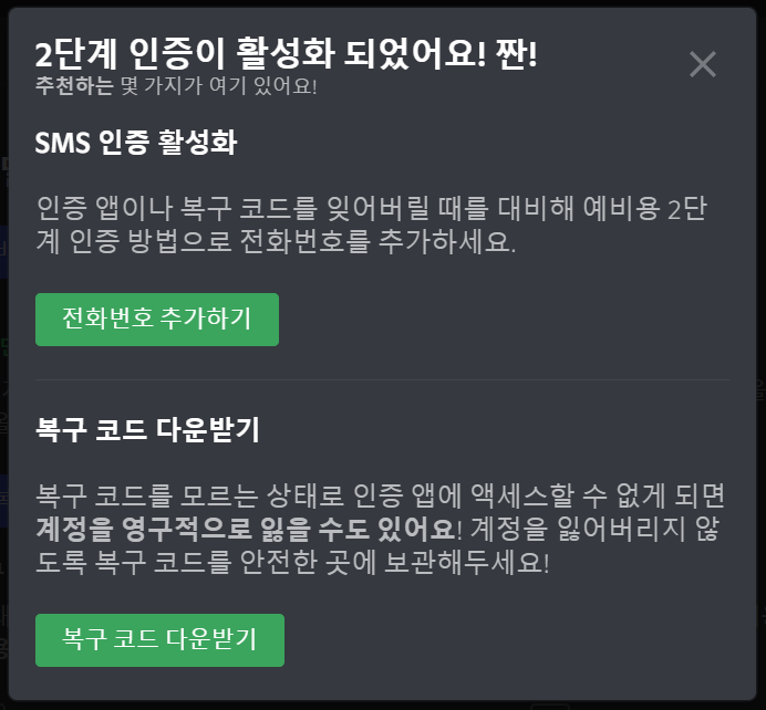 다음과 같이 2단계 인증이 활성화되었어요!라는 문구가 뜨면 2단계 인증 설정이 완료된 것입니다. 창을 닫기 전에 복구 코드를 다운받아 놓으시는 걸 추천드립니다. 복구 코드에 대해서는 아래 설명을 봐주세요.