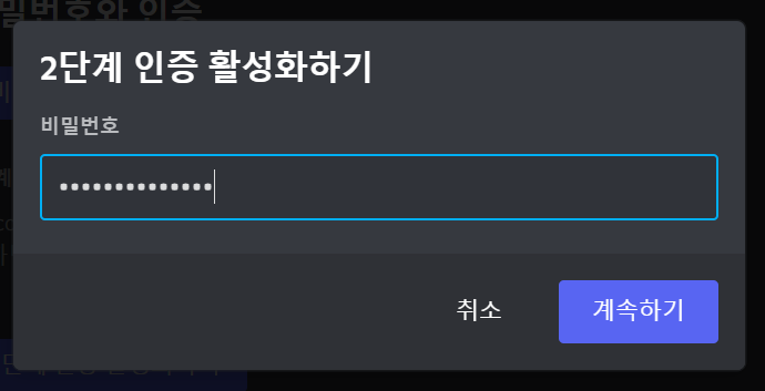 2단계 인증 활성화하기를 누르면 비밀번호를 입력하라 뜨게 됩니다. 비밀번호를 입력하고 계속하기를 눌러주세요.
