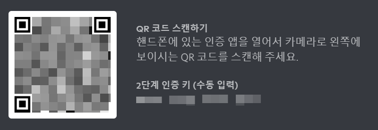 QR코드 스캔으로 등록하려면 디스코드 안내창 왼쪽에 있는 QR코드를OTP 앱으로 찍어주시면 됩니다. 설정키 입력으로 등록을 하려면 디스코드 화면에 2단계 인증키 (수동 입력) 아래에 있는 12자리 문구를 OTP 앱에 입력해주시면 됩니다. QR코드 스캔으로 등록하는걸 추천드립니다! 참고로 위의 QR코드나 인증 키는 남들이 보면 똑같이 OTP 등록을 하고 로그인에 이용할 수 있으니 절대 공유하거나 하지 말아주세요.