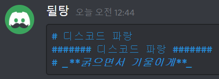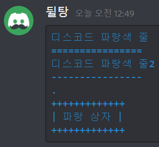 디코에서 파란색 글자를 쳐봅시다! 디스코드에서 파란색은 입력방법이 많은 듯 하면서도 은근히 적은 글자색입니다. 쓰는 방법은 많지만, 그 쓰는 방법이 한 언어명으로 몰려있기 때문입니다. 하지만 다른 말로 말하면 몇몇 언어명에서 입력법만 알면 된다는 뜻이기도 합니다. 이제 파랑 글씨로 디스코드 채팅을 꾸며봅시다!