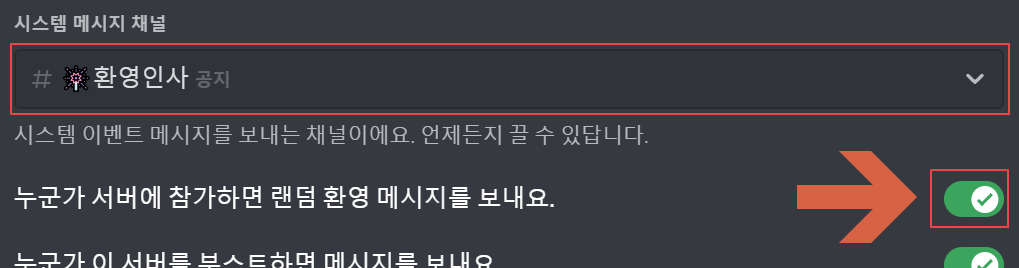 서버에 환영 메시지가 오지 않는다면 서버 설정에서 오도록 바꿔줄 수 있습니다. 우선 화면 왼쪽 위의 서버명을 클릭한 다음 서버 설정을 눌러 들어가 주세요. 그다음 일반에 시스템 메시지 채널 설정에서 위와 같이 환영 메시지를 올릴 채널을 설정하고 환영 메시지를 보낸다는 설정에 체크해주시면 됩니다.