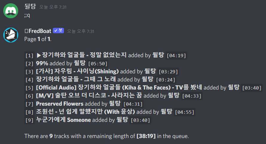 ;;q (queue) - 재생 대기중인 음악들 목록 보기
