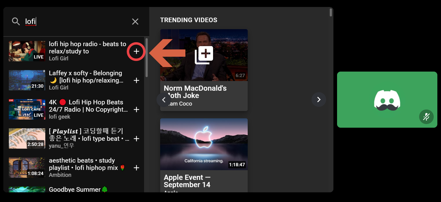 그러면 음성 채팅안에 유튜브 동영상 검색창이 뜨게 됩니다! 화살표의 검색창에서 검색어를 입력하면