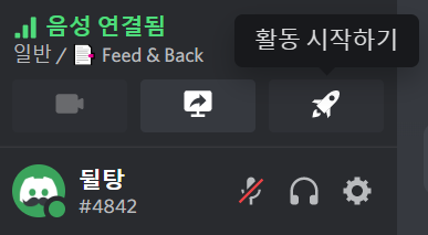 우선 음성채널에 들어가시면 다음과 같이 맨 왼쪽에 로켓 아이콘(🚀) 모양의 활동 시작하기 버튼이 있습니다. 이를 클릭해줍니다.