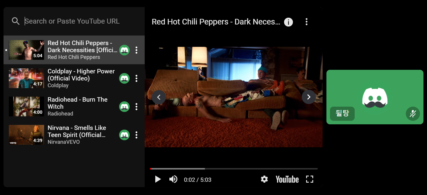 여기서 추가로 다른 동영상을 검색하여 재생목록에 추가할 수 있습니다. 재생목록은 왼쪽에 보이게 됩니다. 기존 음악 봇과 비슷하게 쓰시면 돼요.