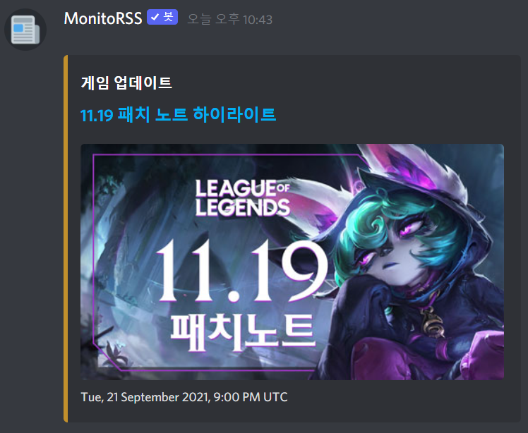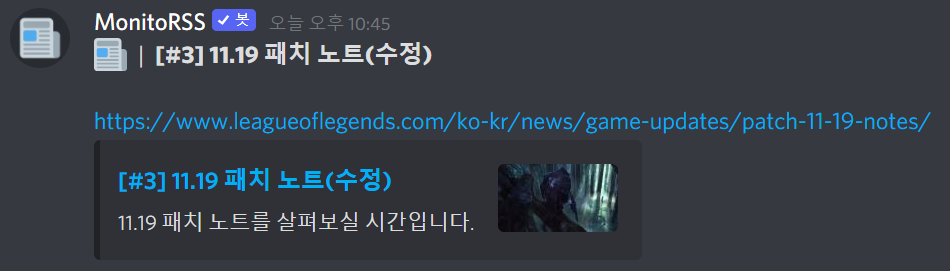 추가로 RSS 주소를 구하면 디스코드에서 MonitoRSS 봇을 이용해 디코로도 롤 패치노트를 알림 받을 수 있습니다! MonitoRSS봇에 대해서는 아래 글을 참고해주세요.