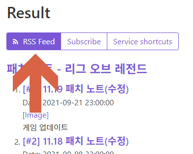 그 후 오른쪽 Result 항목의 RSS Feed를 클릭하시면 됩니다! 클릭해서 나온 사이트의 URL 주소가 바로 RSS 피드 주소입니다. 이제 이 주소를 RSS 리더기나 디코 MonitoRSS 봇에 붙여넣어 주시면 되어요.