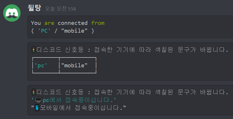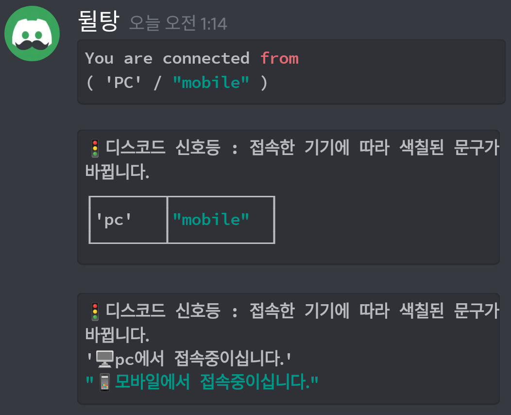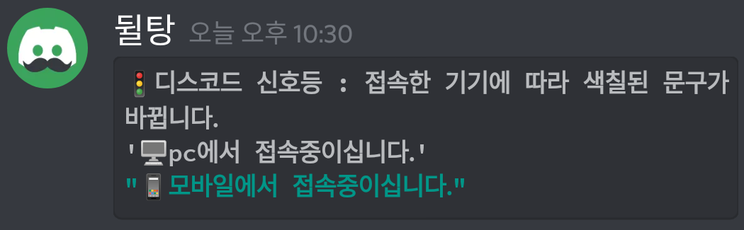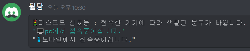 ```sql 🚦디스코드 신호등 : 접속한 기기에 따라 색칠된 문구가 바뀝니다. '🖥️pc에서 접속중이십니다.' "📱모바일에서 접속중이십니다." ```