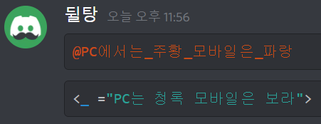 이 외에도 언어명을 py, xml로 설정하면 PC와 모바일에서 색이 다른 메시지를 여러 방식으로 입력할 수 있습니다. 모바일에서 글씨에 색을 입히는 방법에 대해 자세히 알려면 아래 글을 봐주세요!