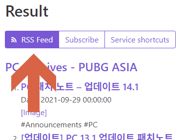 배틀그라운드 사이트는 RSS 주소를 잘 제공하지 않기 때문에 직접 RSS 주소를 만들어줘야 합니다. RSS 주소는 Fivefilters라는 사이트로 만들 수 있습니다.