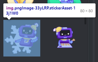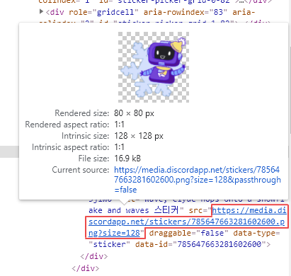그 후 Shift + Ctrl + I를 눌러 개발자 도구를 켜줍니다. (열리지 않는다면 이 글을 참고해주세요.) 맨 위 메뉴의 Element를 누르면 HTML 소스 코드가 보이는데, 코드 왼쪽의 삼각형을 눌러 접었다 펴가며 해당 스티커를 표시하는 img 태그를 찾아주세요. 찾으시면 화면이 다음과 같이 보입니다.