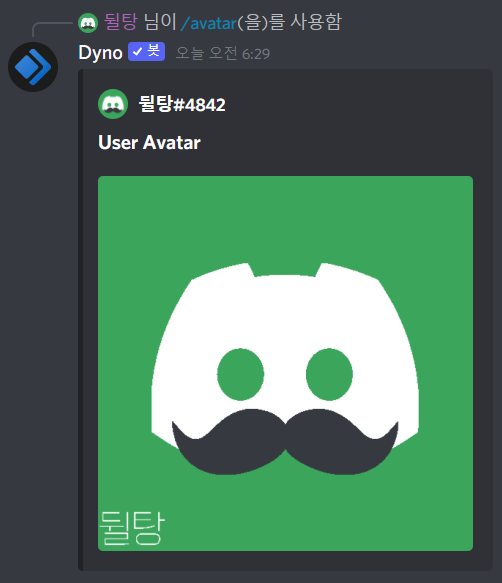 Dyno 봇은 서버를 종합적으로 관리해주는 봇입니다. 이 Dyno봇의 명령어 중에 다른 사람의 프로필 사진을 가져오는 명령어도 있습니다.