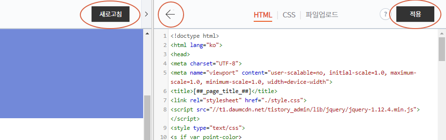 다 붙여넣으셨으면 화면의 새로 고침 버튼을 눌러 확인해보세요. 만약 이상해졌으면 왼쪽 방향 화살표(←)를 눌러 저장하지 않고 뒤로 가주세요. 적용이 잘 되었으면 적용 버튼을 눌러주세요.