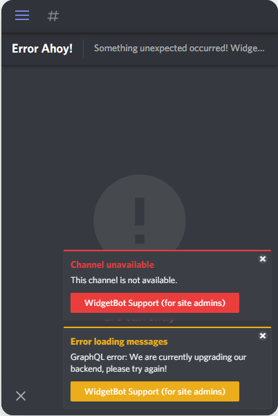 다음과 같이 디코 위젯 봇이 Error loading messages나 Channel unabailable, guild unabailable 경고 문구를 띄울 경우에는 사이트를 한 번 껐다가 켜주시면 잘 작동합니다.