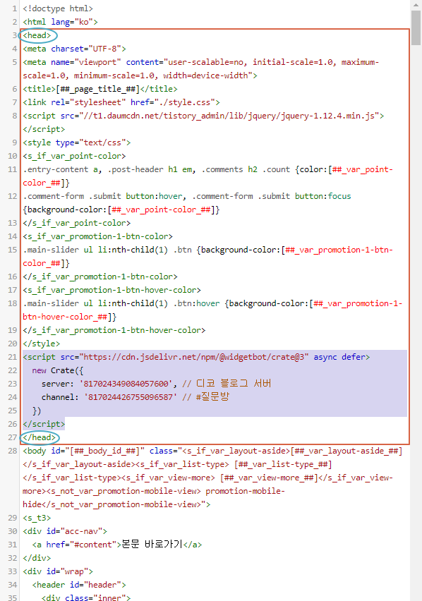 덮어서 붙여넣어서 다른 코드가 사라지면 안 되니 저처럼 이렇게 </HEAD> 바로 위에다가 빈 줄 하나를 만들어두고 거기다가 붙여넣어 주세요.