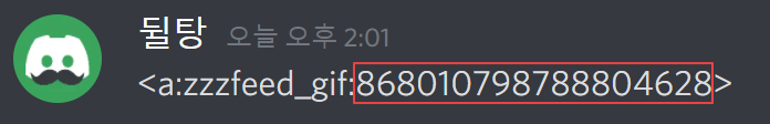 그러면 다음과 같이 채팅이 뜨게 됩니다. 여기서 빨간색 박스친 뒷부분이 이모지 ID입니다! 이모지 ID는 봇이나 웹훅에서 이모지를 입력해야할 때 유용합니다.