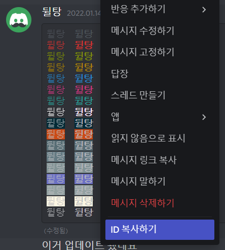 메시지에서 프사나 유저명 이외의 곳에다가 우클릭을 해 ID 복사하기를 해주시면 됩니다!