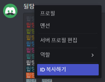 메시지에서 프사나 유저명 이외의 곳에다가 우클릭을 해 ID 복사하기를 해주시면 됩니다!