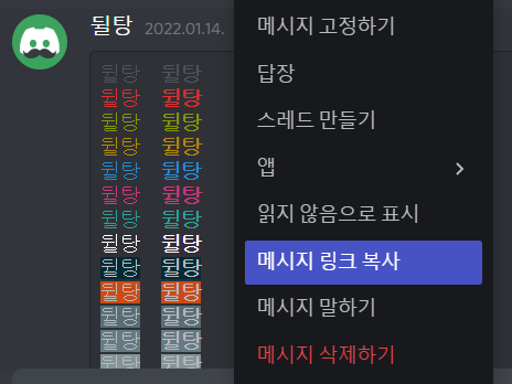 봇을 개발하지 않는 사람들에게도 ID는 유용합니다. 여러 정보를 알 수 있거든요. 예를 들어서 메시지 링크 복사를 통해 메시지 링크를 확인해보시면