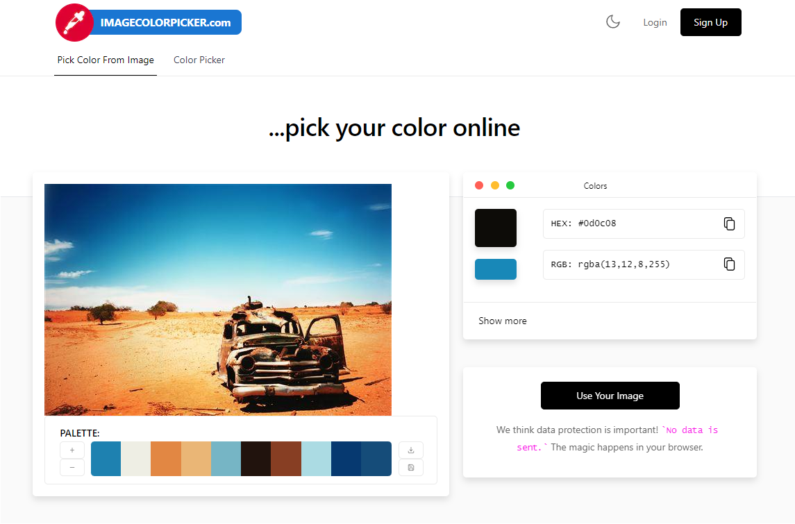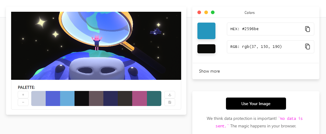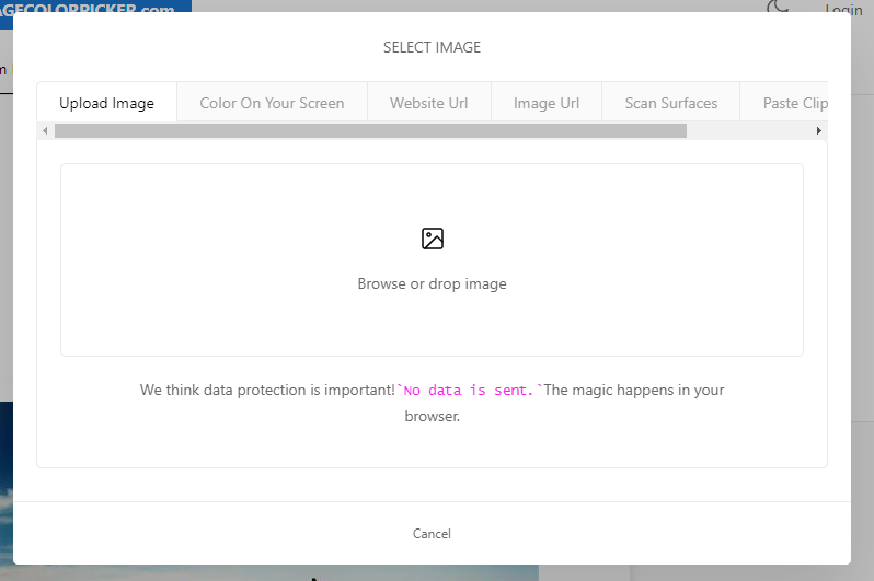 색상 코드를 얻고 싶은 파일을 업로드합니다. 브라우저에서 찾아도 되고 아님 드래그 엔 드롭으로 인터넷 창에 끌어다 놓으셔도 됩니다. 이 때 업로드 되는 파일은 저장되지 않는다니 안심하시고 올려도 될 거 같습니다!