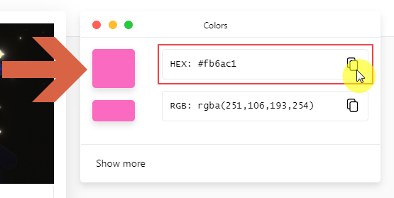 클릭하시면 다음과 같이 위쪽 사각형의 색이 바뀜을 확인하실 수 있습니다. 이 때 빨간색 사각형으로 테두리 쳐 놓은 부분이 바로 색상 코드입니다! 옆의 복사 모양 아이콘을 눌러서 구한 색상 코드를 복사해주시면 됩니다.