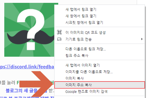 이미지의 주소는 주소를 얻고 싶은 이미지에다 우클릭 하신 후 이미지 주소 복사를 눌러주시면 됩니다.