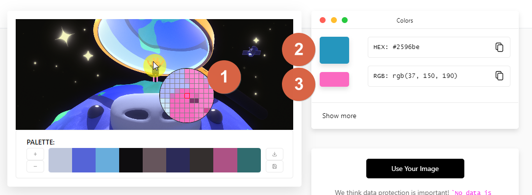 우선 사진 위에 마우스를 올려놓으면 1번처럼 어느 픽셀을 보고 있는지 뜨게 됩니다. 2번은 이전에 선택된 색상입니다. 3번은 현재 보고 있는 픽셀의 색상입니다. 사진 위에서 마우스를 옮기다 보면 3번의 색이 바뀌는 것을 확인할 수 있습니다. 움직이다가 맘에 드는 색상을 발견하면 클릭해서 선택해주세요.