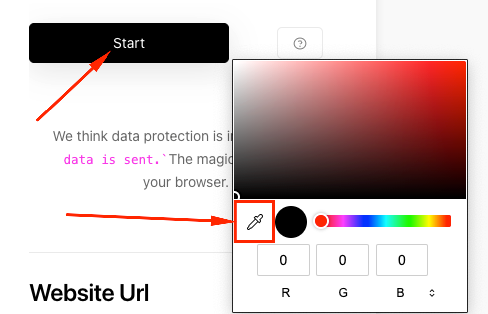 현재 화면에서 컬러코드를 직접 뽑습니다! Start 버튼을 누르시고 사진처럼 스포이드 도구를 눌러주시면 됩니다. 만약 되지 않는다면 다른 방식을 이용해주세요.