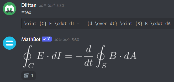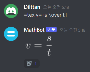 다음처럼 =tex 뒤에 LaTeX 문법으로 적어주면 봇이 해당 수식을 이미지로 만들어줍니다. 아래 휴지통 모양 반응(🗑️)을 클릭하여 수식을 지워줄 수 있습니다.