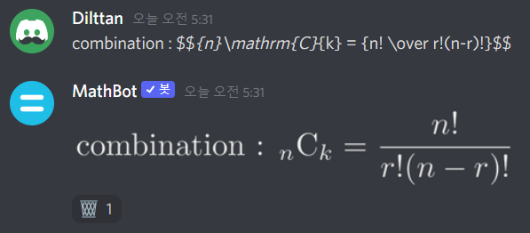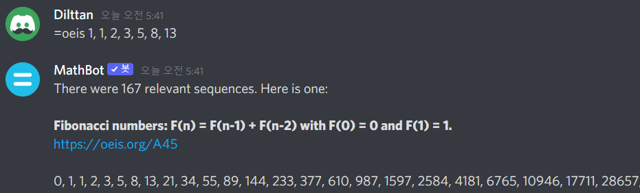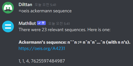 MathBot은 말 그대로 수학봇입니다. LaTeX 방식으로 입력하면 그 수식을 이미지로 올려줍니다. 또 울프람 알파(Wolfram alpha)에서 검색한 내용을 띄워주기도 하죠. 수식을 입력하면 계산해서 결과를 띄워주는 계산기 역할도 있습니다. 또 oeis에서 수열을 검색할 수도 있죠. 이런 여러가지 수학에 관련된 기능들을 알아봅시다!